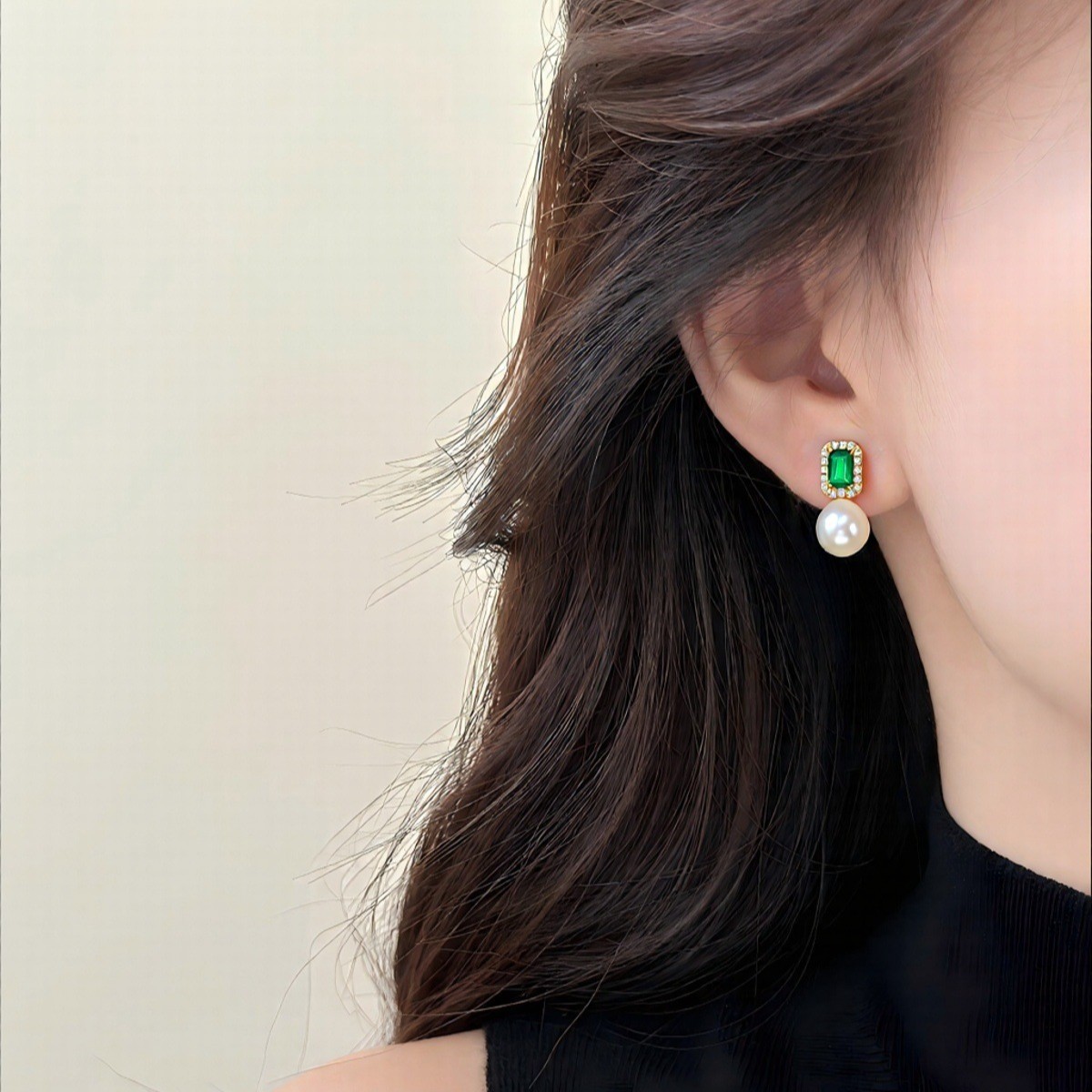天然淡水パールのスタッドのイヤリングの絶妙なヴィンテージスタイルジルコン、エメラルドパールイヤリング